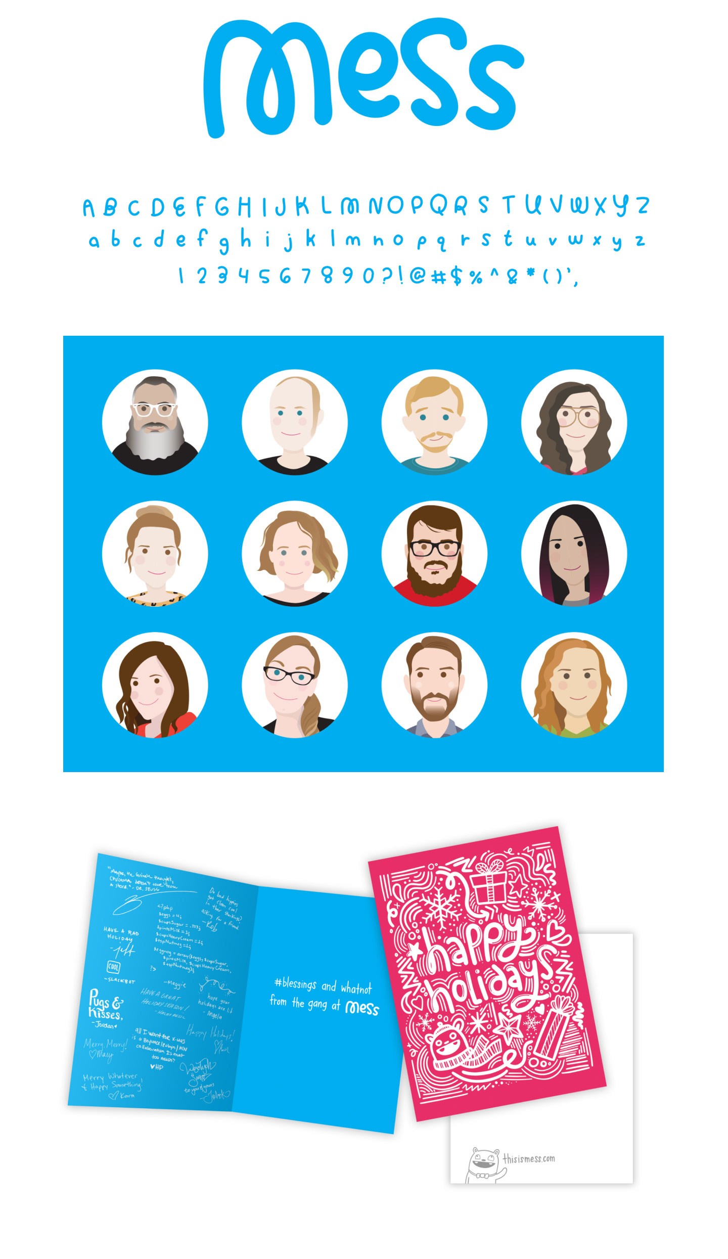 While at Mess, I was asked to create a new hand lettered logotype for the agency, as well as an accompanying decorative font. I also created illustrated avatars for use on the company website and a holiday card to showcase the new branding.